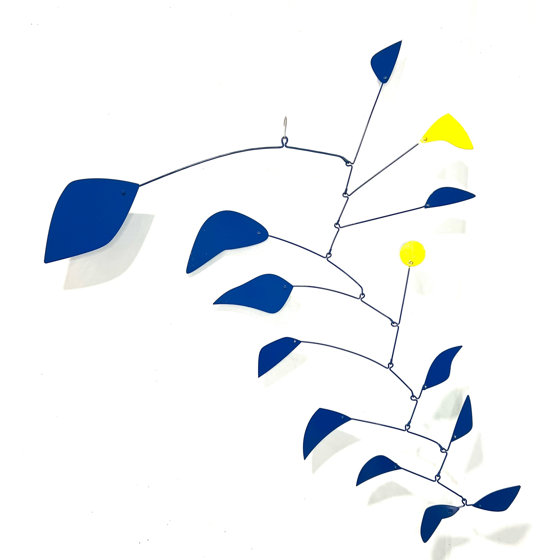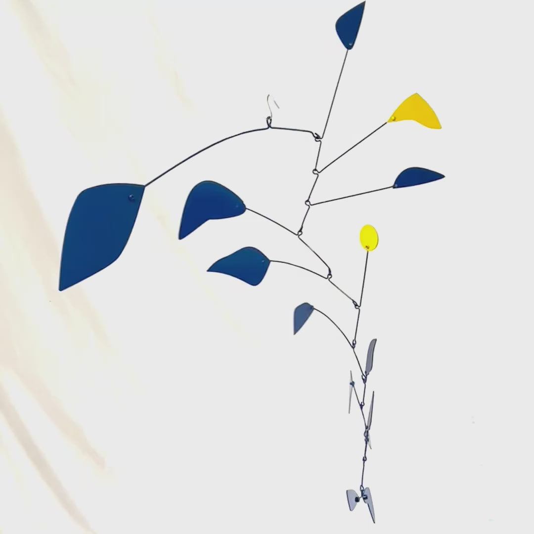 Este móvil para colgar representa los primeros rayos de sol que se cuelan a través del azul matinal. Con la brisa se generan movimientos armónicos. De formas simples y suaves, pareciera que cada una de ellas tuviera vida propia. Especial para adornar espacios altos, living, comedores, terrazas cubiertas o cajas de escala.